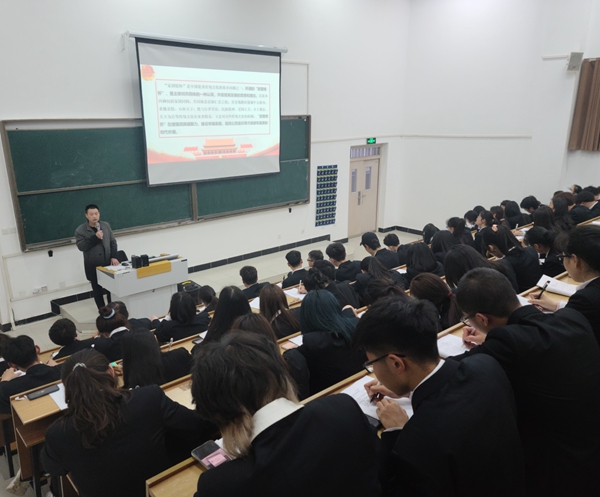 黄德垚以“当代大学生的家国情怀”为主题,先介绍了“什么是家国情怀”---“家国情怀”是中国优秀传统文化的基本内涵之一。所谓的“家国情怀" ,是主体对共同体的一种认同,并促使其发展的思想和理念。之后向同学们介绍了知名学者对爱国主义家国情怀的看法,并鼓励同学们要牢记使命,听党话、跟党走,用爱国之情激扬青春之志,将个人理想融入中华民族伟大复兴的中国梦,用勤奋学习焕发青春光彩,在专业学习中增长知识、锤炼品格,在社会实践中增长才干、练就本领。加强政治理论学习,认真学习党史,学习马克思主义理论经典著作,树立正确的政治观念,坚定共产主义信仰,做一名马克思主义坚定的拥护者、追随者。