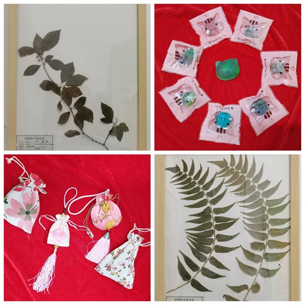 药学院学生结合中药学专业知识,采用大红袍红茶、黑茶、绿茶、红豆、绿豆、薏仁、燕麦、菊花、枸杞、银杏叶等各类落叶及干花等原材料制作出了一幅幅精美的标本、茶画,除此之外,大家制作了养生香囊以及卡通款植物香皂。