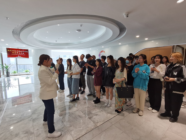 同学们在薛美玲带领下,参观企业文化墙、网络直播间、公司荣誉墙等具有企业代表性的展览点。参观期间,同学们积极提问,讲解人员耐心细致的为同学们解答。