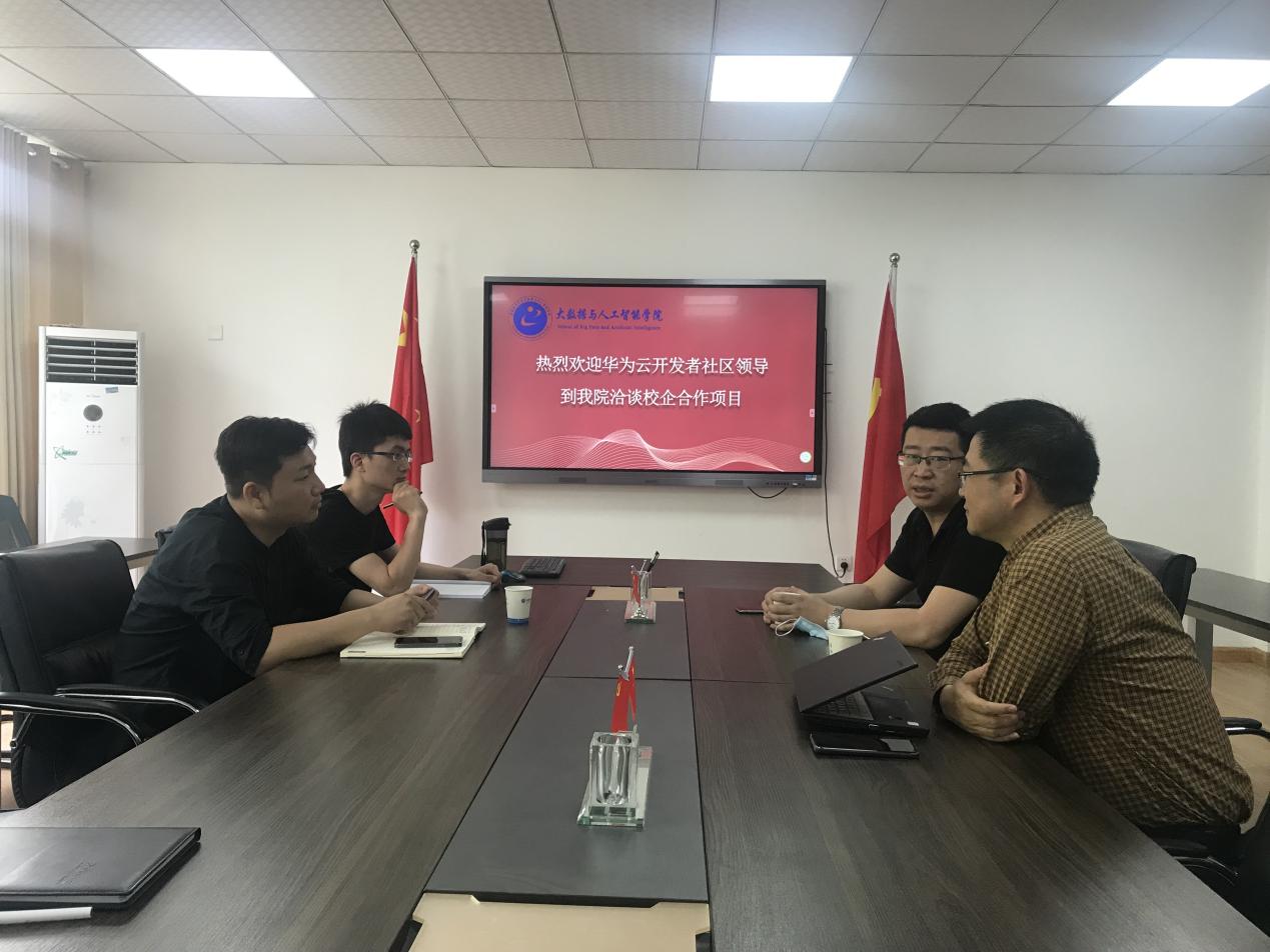 双方与会人员对校企合作的途径、形式、内容等进行探讨,并达成初步共识。最后,吕翔提出,大数据与人工智能学院要抓紧与华为云开发者社区就合作具体事宜制定方案,以学生职业规划、课程优化等为切入点,积极主动与企业联系,尽快实现联合培养,以更好地为学生服务,为企业服务,为培养出适合时代发展,满足国家产业升级需要的信息类行业人才做出自己的贡献。