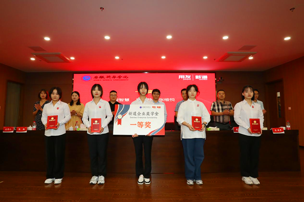 随后,吕京波宣读《关于授予谢晓雅等61名同学“用友新道”奖学金的决定》。校企双方领导为2019级、2020级共61名“用友新道”奖学金获得者颁奖,并为2021级新生代表授予“云财务管理会计师”专属徽章,鼓励全体新生在新学期取得更大进步。