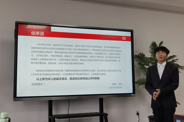 会议中,申请人通过精心准备的PPT一一展示了自己在校期间思想表现、学习成绩、创新能力、社会实践、综合素质等方面取得的突出成绩。他们的精彩汇报,赢得了在场师生的阵阵掌声。