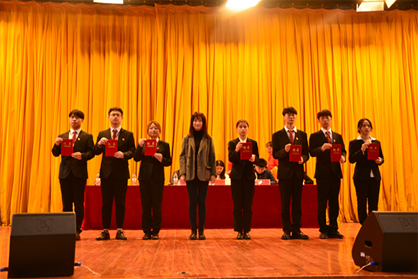 随后,新老两届主席团代表交接助理团团旗,并代领全体助理团成员宣誓。郜恩晴作为新一届成员代表发言,她从入团初衷、工作职责等方面表达了对助理团工作的理解,表示将充分利用这个温暖的组织,成就自我,服务服务学院。新一届团长陈龙发言,他表示,将在接下来的工作中努力带头,严于律己,他希望全体成员齐心协力,用热情满满的行动服务全院师生,以学院发展贡献一份坚实的力量。