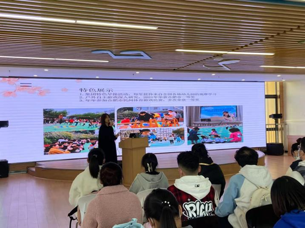 同时,园所活动区域宽阔的场地、丰富的设施器材、幼儿教师的热心尽责及恰如其分的指导,无不体现出该园所“走进童心,保护童心,顺应孩子的发展,为孩子的成长提供一切尽可能的帮助”的教育理念以及“做有温度的幼儿教育”的办园思想,让学前教育专业学生学到了很多宝贵的幼儿教育教学工作经验。观摩活动结束后,幼儿园张主任与同学们进行了集中的活动交流分享,同学们分享了自己的所见所感所想。张主任也针对同学们的疑问积极耐心地进行了答疑解惑。