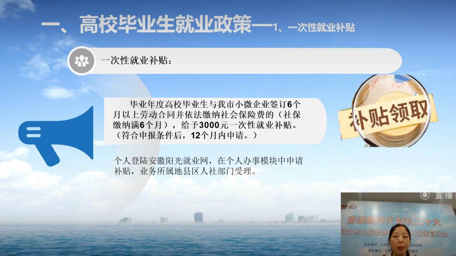 本网讯(通讯员:龚宛琦)为推进2023届毕业生充分就业,为广大毕业生提供高效、便捷、精准的就业创业政策服务,10月12日19:00,beat365官网开展了“奋进新时代,献礼二十大”就业创业政策进校园专题讲座,本次讲座由合肥市人力资源和社会保障局就业促进和失业保险处王梅主任与省“启明星”就业指导专家团成员周虎律师担任主讲,1000余名2023届毕业生在线观看。