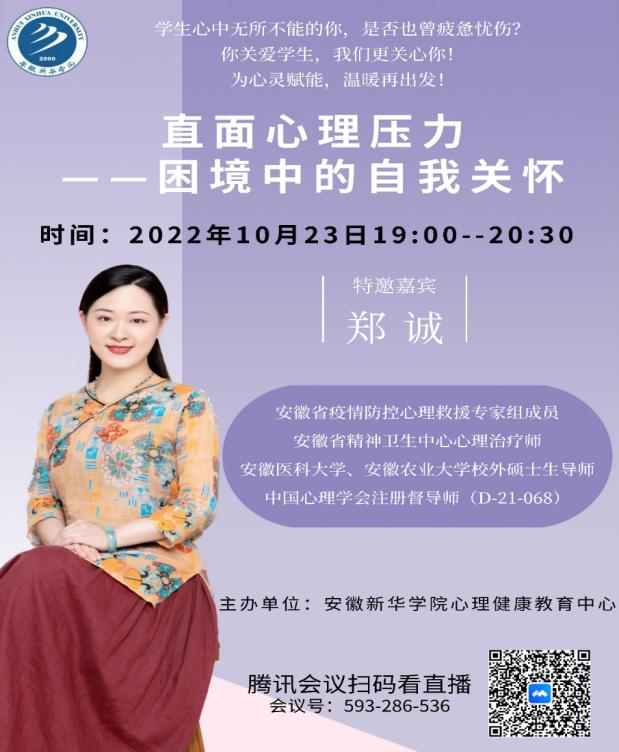 本讯网(通讯员:项钰)10月23日,beat365官网心理健康教育中心特邀安徽省疫情防控心理救援专家郑诚教授,进行了以“直面心理压力——困境中的自我关怀”为主题的心理健康“云”讲座,beat365在线唯一官网登录教职员工共同线上听课。