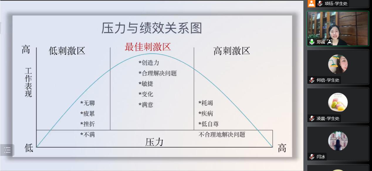 讲座中,郑诚教授介绍了疫情背景下各类群体的心理状况,并以典型案例为切入点,围绕着“情绪和行为的形成、压力是什么、容易引起压力的情境、教职工压力的基本来源、困境中的自我关怀”等五个方面展开,重点讲授了自我关怀的“认可你自己”“调整认知和行为”“用放松的方式缓解压力”“改善沟通方式”“不要讳疾忌医”五种有效缓解压力的方式,引导大家积极面对,合理应对内心困惑。