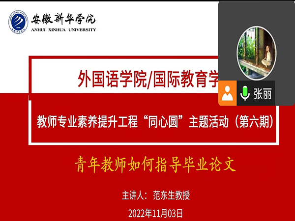 本网讯(通讯员:吴艳)为了进一步提升学院毕业论文(设计)质量,提高新进教师毕业论文指导水平,帮助他们高质量地指导毕业论文,外国语学院/国际教育学院于2022年11月3日通过腾讯会议线上开展以“青年教师如何指导毕业论文”为主题的教师素养提升工程——同心圆系列活动(第六期)。外国语学院/国际教育学院执行院长杨磊,院长兼国际教育学院顾问范东生,院长助理李怡嘉,教师发展中心主任张丽,以及近三年新进教师参加了本次活动,会议由学院教师发展中心主任张丽主持。