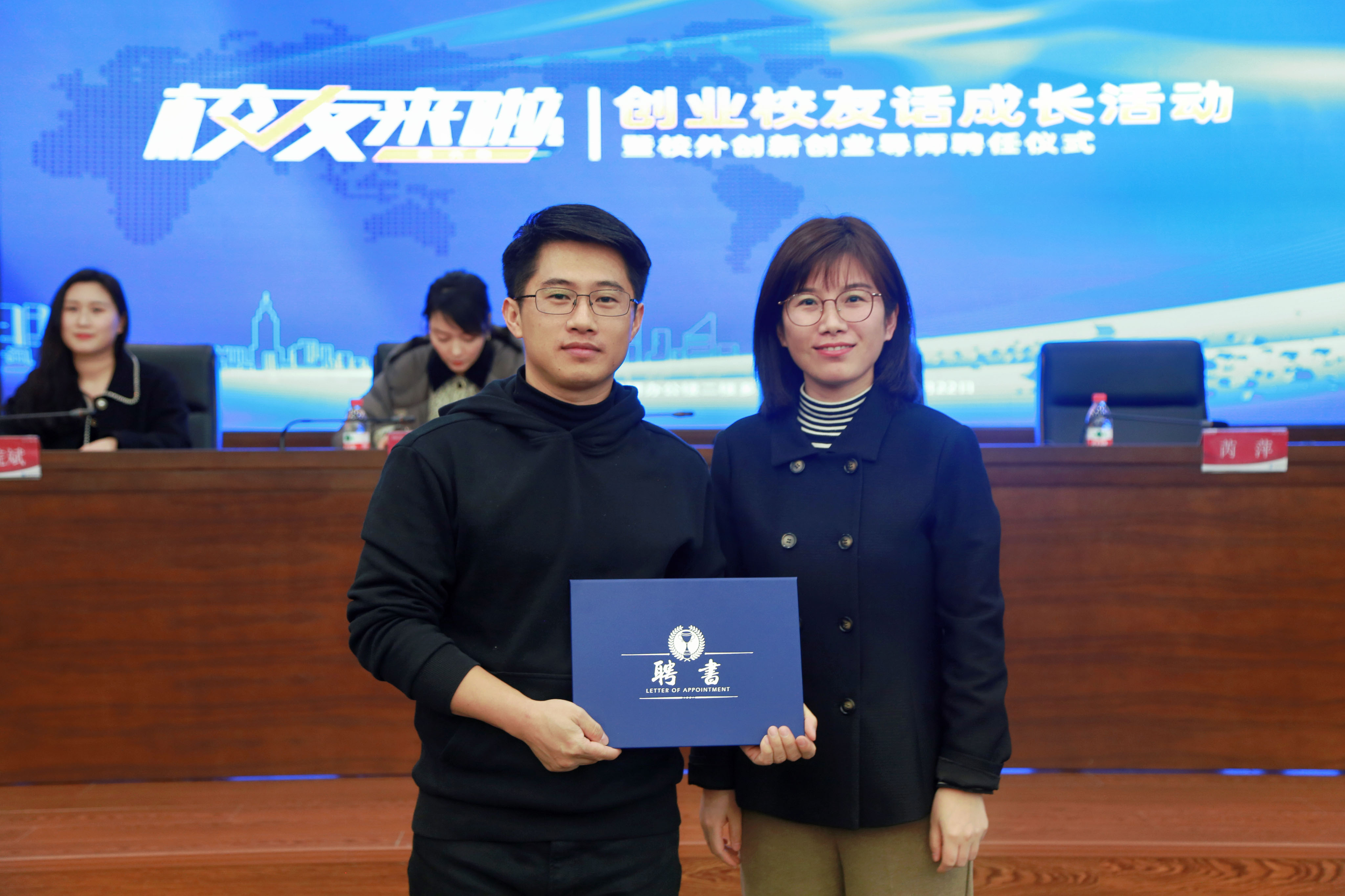 首先由孙珊珊宣读聘任文件,她强调校友是母校永远的牵挂,希望校外创新创业导师发挥所长,加强与母校联系,整合资源,为学校大学生创新创业和就业工作做好指导和服务。