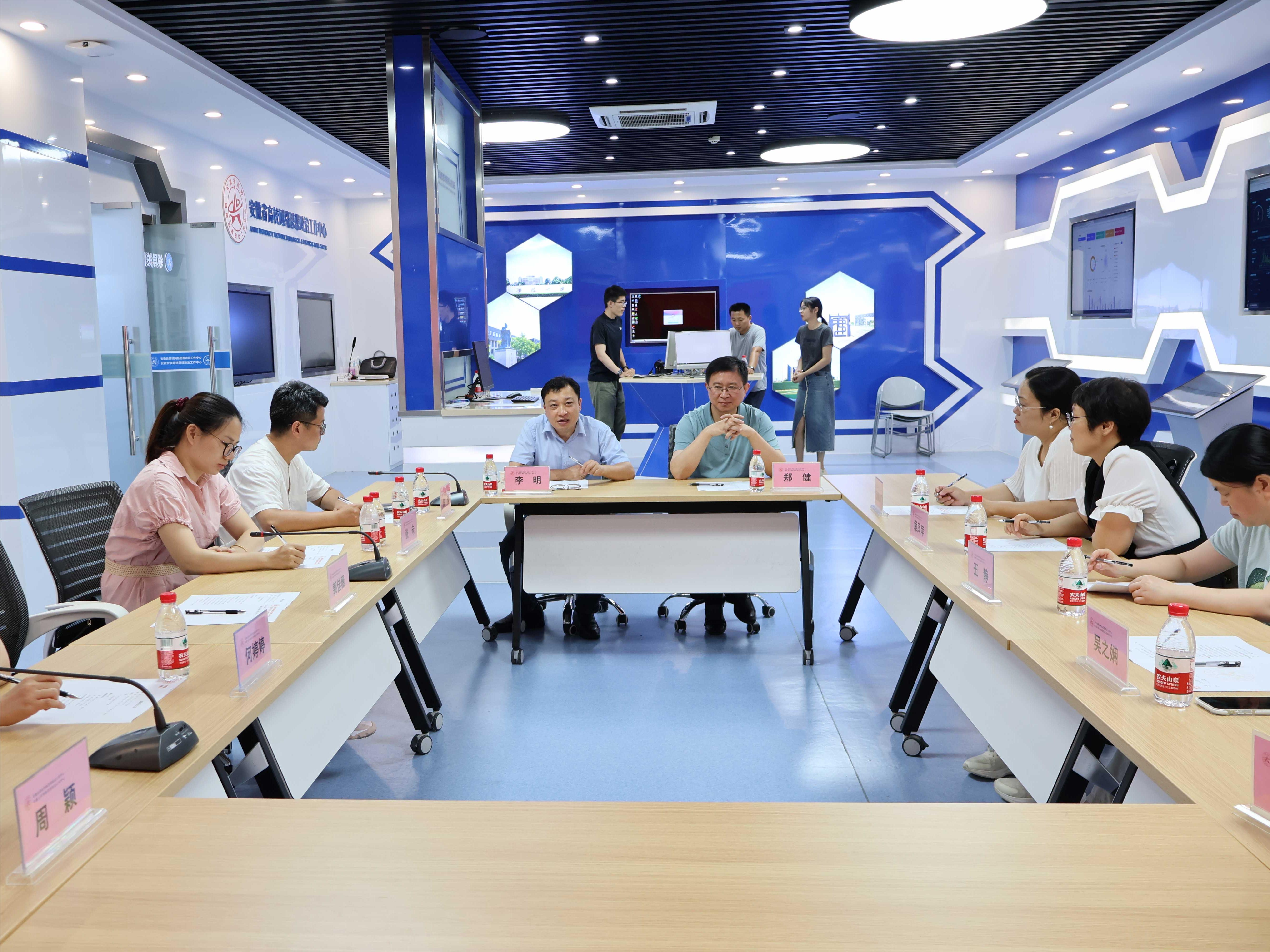 本网讯(通讯员:吴之娴)为有效提升新媒体新技术应用水平,推动思想政治工作传统优势同信息技术高度融合,增强时代感和吸引力,7月7日,beat365官网马克思主义学院副院长董丽娟率队6人赴安徽省高校网络思想政治工作中心(以下简称“中心”)考察调研,学习网络思政建设工作和智慧思政平台建设有关经验。中心常务副主任郑健、安徽大学马克思主义学院副院长李明热情接待beat365官网一行。