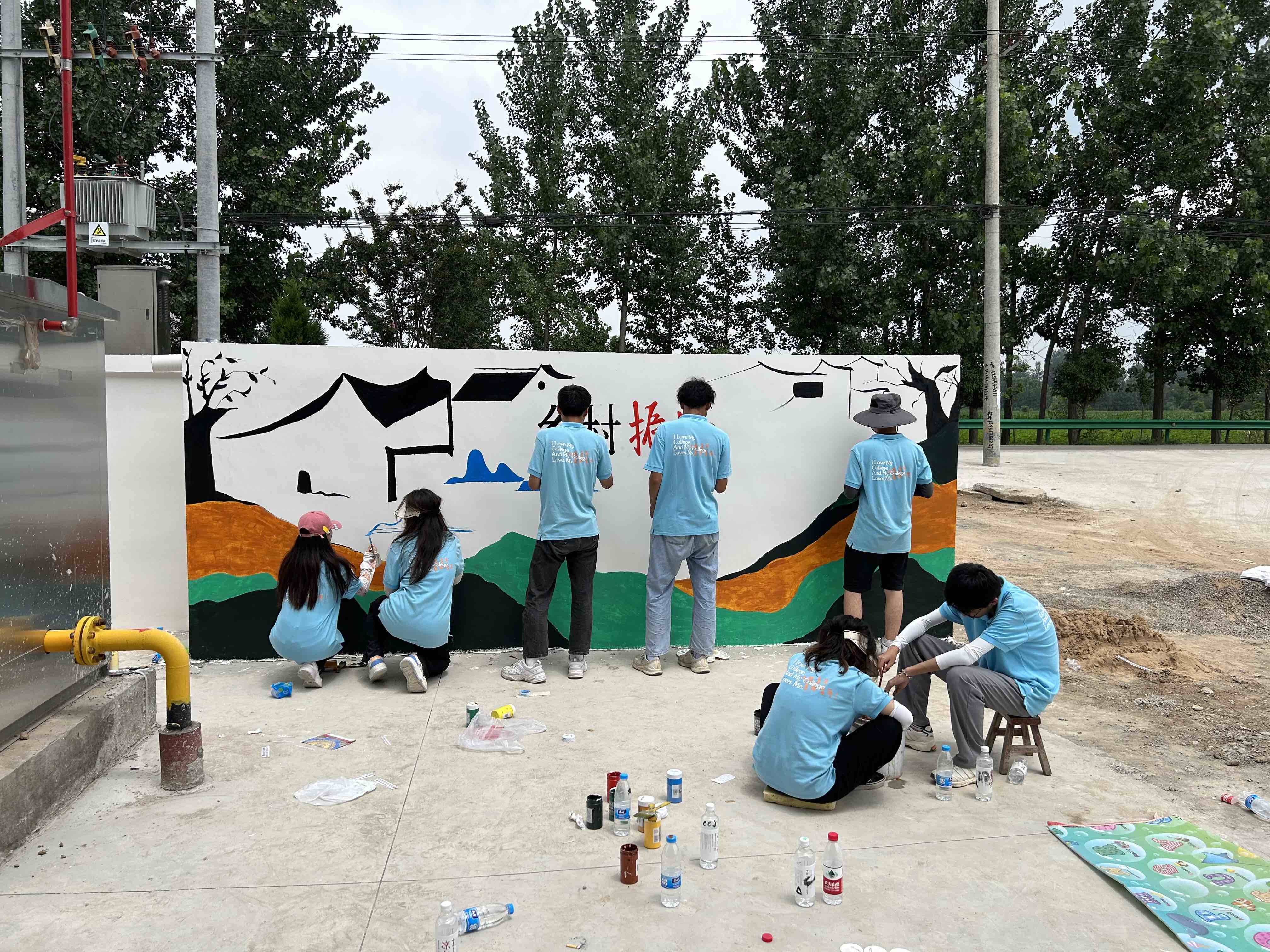烈日当头、蚊虫袭扰,队员们埋头苦干,利用丙烯颜料在墙面上一笔一画地画着,构图、起形、调色、上色、精修,反复打磨每一面墙绘、认真勾勒每一个细节。经过实践队员们不懈努力,顺利完成了墙绘作品。看着自己绘制的墙绘,给乡村振兴建设增添艺术色彩,让乡村面貌焕然一新,让普通的墙壁变成美观的文化传播者,队员们的成就感也油然而生。路过的村民们纷纷称赞,用心绘制的墙绘获得了他们的一致好评。实践队员们将艺术融入乡村生活,发挥特长,以青春助力乡村振兴,以实际行动谱写乡村振兴新篇章。
