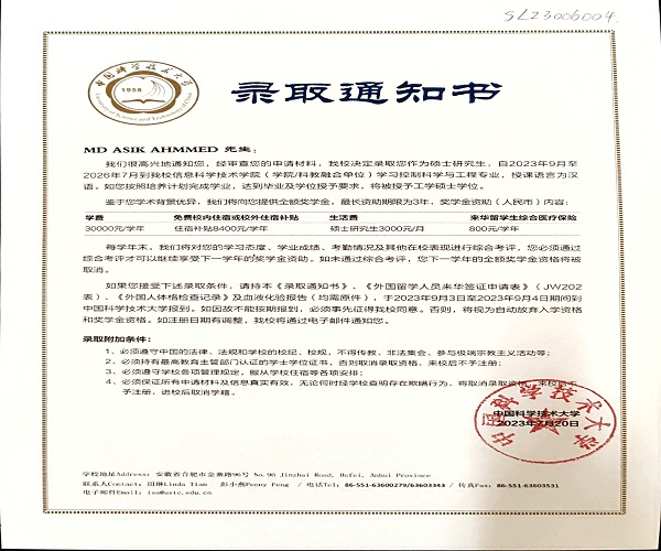 本网讯(通讯员:田歌)近日,beat365官网2023届电气工程专业留学生MD ASIK AHMMED(中文名:艾明)收到了中国科学技术大学控制科学与工程专业的硕士研究生录取通知书,并获得了该校的全额奖学金。
