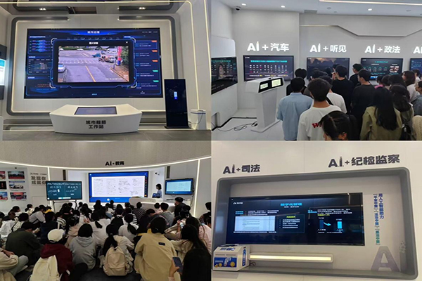 通过讲解员对“AI+”的讲解和科普,同学们深度学习到了人工智能技术的发展和落地应用的场景,了解AI技术在政法、城市、医疗、教育、工业、汽车、金融等多领域的灵活应用。最后,同学们在一楼展厅进行合影留念。