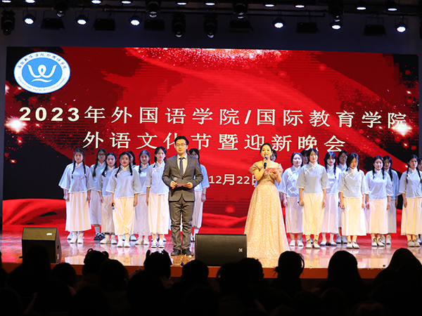 本网讯(通讯员:梅珊珊):外绽华彩,‘新’随乐动。12月22日,外国语学院/国际教育学院举办的外语文化节暨迎新晚会,在学校大礼堂隆重举行,群“新”璀璨,心随乐动。这个夜晚承载着多元文化的活力,承载着全院师生的心力和努力,承载着青春的向心力。
