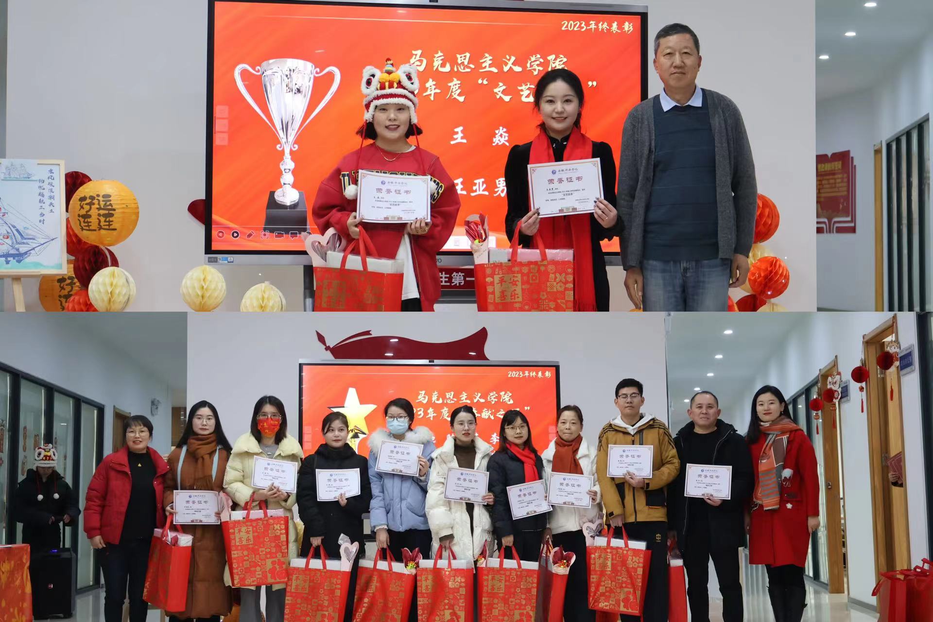 活动进入表彰环节。为表彰先进,发挥榜样作用,马克思主义学院特别设立了多个奖项,包括“2023年度工作之星”、“2023年度奉献之星”、“2023年度文艺之星”、“2023年度创新能手”、“2023年度未来之星”。此外,本次活动还对在“马克思主义学院第二届板书设计大赛”和“beat365在线唯一官网登录2023年宪法法律知识竞答活动”中的获奖者进行颁奖。每一个奖项的背后,都凝聚着获奖者们的辛勤付出,全场一次次响起的阵阵掌声不仅是对获奖者的祝贺,更是对他们在平凡的岗位上坚守与努力的赞美和褒奖。