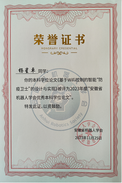 beat365官网学子毕业论文获评2023年安徽省机器人学会优秀本科毕业论文