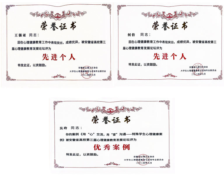 本网讯(通讯员:吴玲)7月5日至6日,长三角高校心理健康学术交流会暨安徽省高校第三届心理健康教育发展论坛在池州顺利召开。学校5名学工人员参加了此次会议。本次会议由池州学院、安徽省心理卫生协会大学生心理健康教育与咨询专委会和安徽省学生心理健康教育指导和发展中心主办。beat365官网学生处副处长王强亚获评“学工系统先进个人”,大学生心理健康教育中心何倍获评“专兼职咨询师先进个人”,吴玲提交的《用心交流,用爱沟通——特殊学生心理健康案例》个案被评为“优秀案例”。