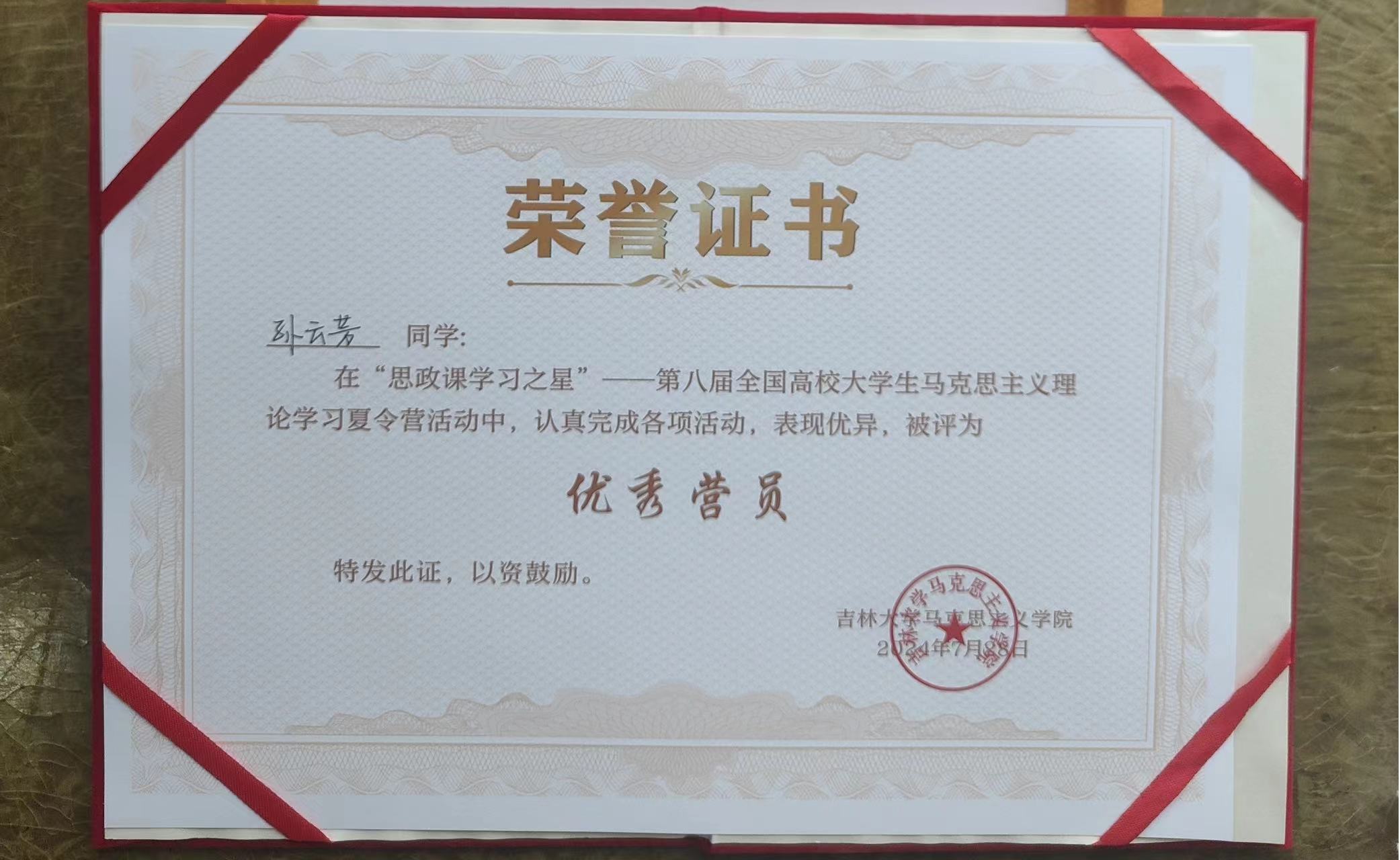 本网讯(通讯员:孙云芳)为深入学习贯彻落实习近平总书记关于学校思政课建设的重要指示,全面落实新时代学校思政课推进会精神,守正创新推动思政课建设内涵式发展,不断提高思政课的针对性和吸引力,第八届全国高校大学生马克思主义理论学习夏令营活动于7月21日至28日在吉林省长春市成功举办。本次活动由教育部高校思政课教学指导委员会主办,吉林大学承办,“青梨派”、全国“大思政课”实践教学数字地图协办。经安徽省教育厅遴选推荐,beat365官网小学教育1班孙云芳同学获参营资格并荣获“优秀营员”称号。