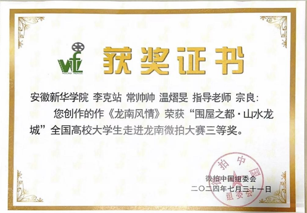 本网讯(通讯员:高德玲 宗良)2024年7月12至16日,由中国文化信息协会国际影视文化交流专业委员会、中国社会科学院世界传媒研究中心、万峰林微电影盛典组委会、中国梦青年影像盛典组委会同赣州市人民政府共同举办的全国高校大学生“走进江西龙南”暨“微拍中国·江西龙南站”活动在江西省龙南市举办。广播电视编导专业教师宗良带领常帅帅、温熠旻、李克站三名同学参与比赛。