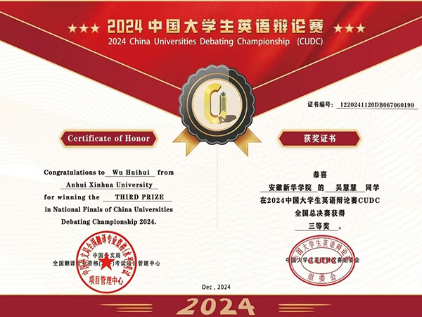 本网讯(通讯员:丁季红)近日,2024年第四届中国大学生英语辩论赛(B类)全国总决赛圆满落幕,外国语学院吴慧慧、杜晓冉两位同学与来自清华大学、北京大学等全国115所高校队伍同台竞技,荣获全国三等奖,beat365官网获评优秀组织单位。这一荣誉不仅是对参赛学子英语水平和辩论能力的肯定,也是对学院教学质量和育人成果的认可。