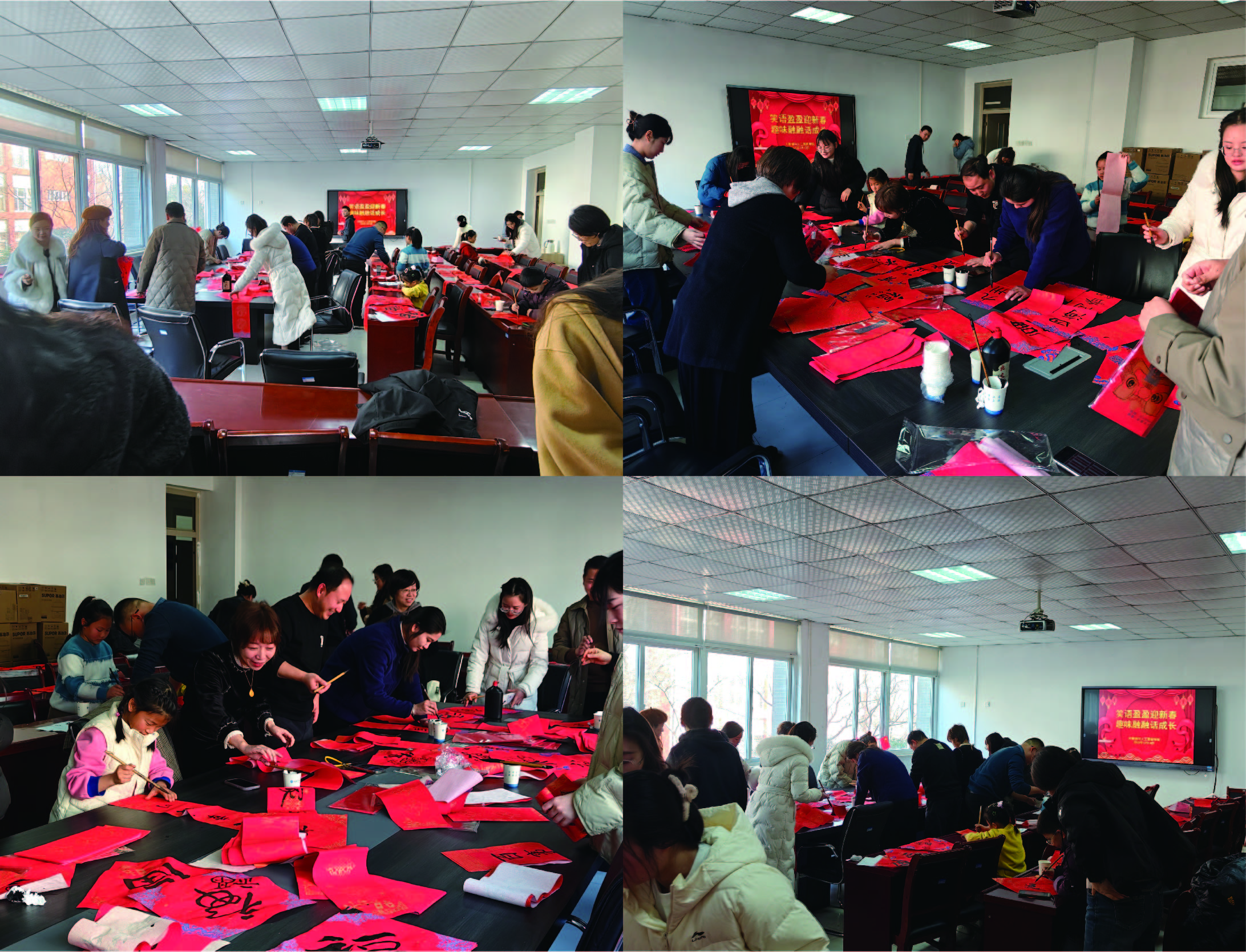 当天,学院在二楼205会议室举行“笑语盈盈迎新春,趣味融融话成长”全体教职工写春联活动。活动邀请了艺术学院的姜春老师现场指导大家写春联。广大教职工们积极参与,在喜庆洋溢的音乐声中书写着一幅幅充满美好祝愿的春联。