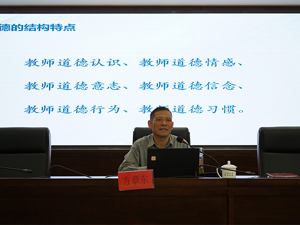 在讲解师德师风内涵时,方教授将其定义为教师维护社会公共利益应遵循的道德规范,着重强调 “师爱” 是师德的核心。为了让老师们更直观地感受师德的力量,他列举了张桂梅、张玉滚等先进典型的感人事迹。张桂梅校长扎根贫困地区,克服重重困难创办女子高中,帮助众多山区女孩改变命运;张玉滚老师坚守乡村教育一线,用扁担为孩子们挑来学习生活用品,多年如一日默默奉献。这些榜样用实际行动诠释了高尚师德的内涵,令在场教师深受触动。同时,方教授也展示了一些违反师德的警示案例,如部分教师发表不当言论、存在学术不端等行为,通过正反案例对比,让老师们深刻认识到师德师风建设的重要性和紧迫性。