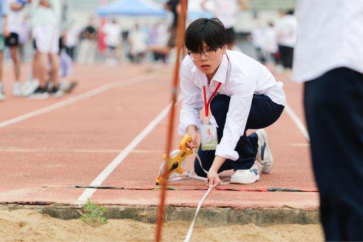 文化与传媒学院的孙夏天坦言是受到体育老师的吸引,了解到了学生助理裁判这个特别的角色,便毫不犹豫地报名了。作为一名跳远学生助理裁判,为了胜任这份工作,孙夏天参与了从赛事规则到跳远如何测量距离等一系列的系统培训。“老师手把手教我们如何规范测量跳远距离,从落地点的确认到精确丈量,每个步骤都容不得半点马虎。”