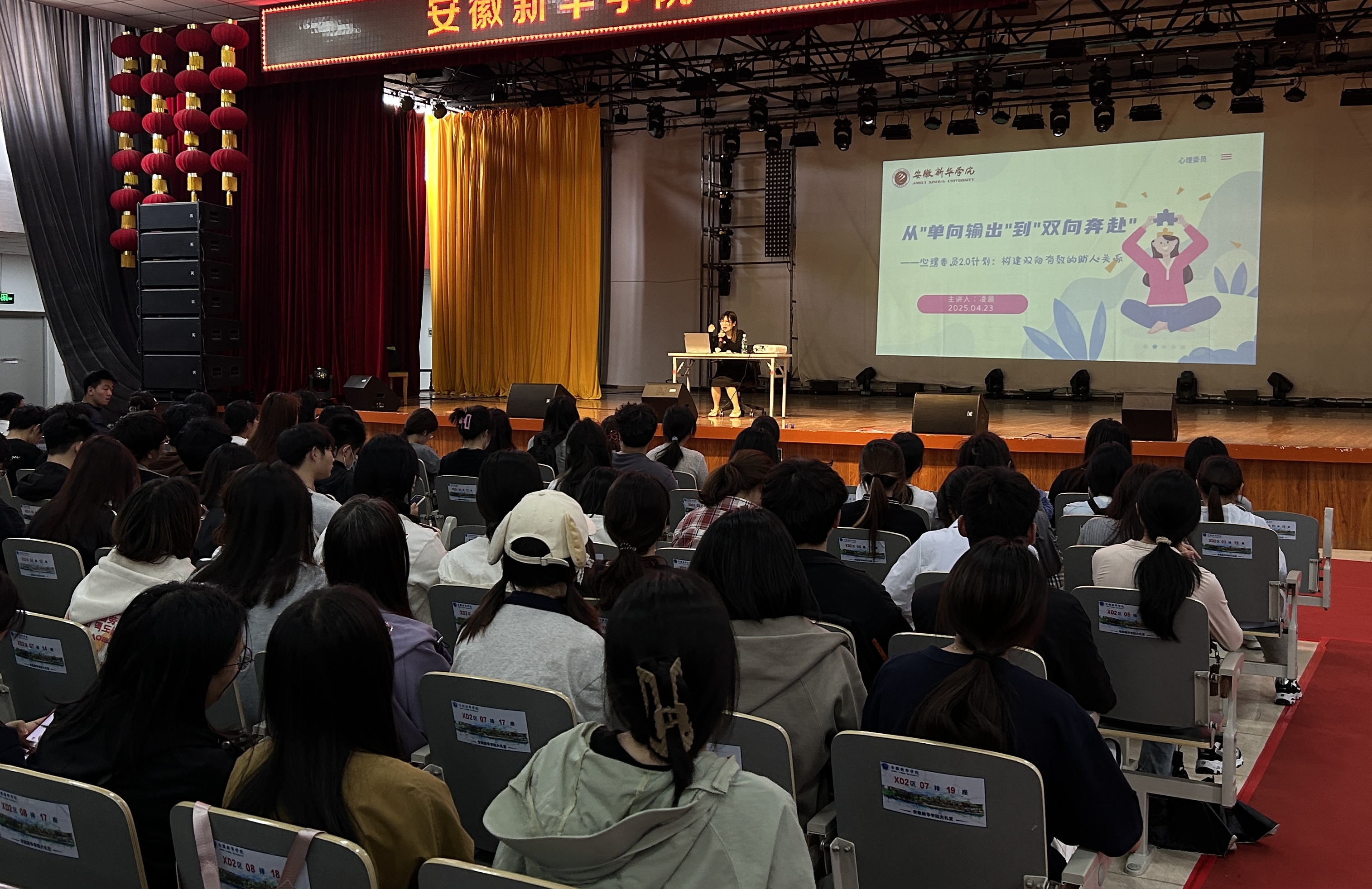 本网讯(通讯员:吴玲)为充分发挥心理委员在大学生心理健康教育工作中的作用,进一步加强学校心理工作骨干队伍建设,4月23日中午,beat365官网心理健康教育中心在大礼堂成功举办了“向阳携行”心理委员专题讲座,beat365在线唯一官网登录心理健康教育中心凌晨老师主讲,全校300多名心理委员参与此次讲座。