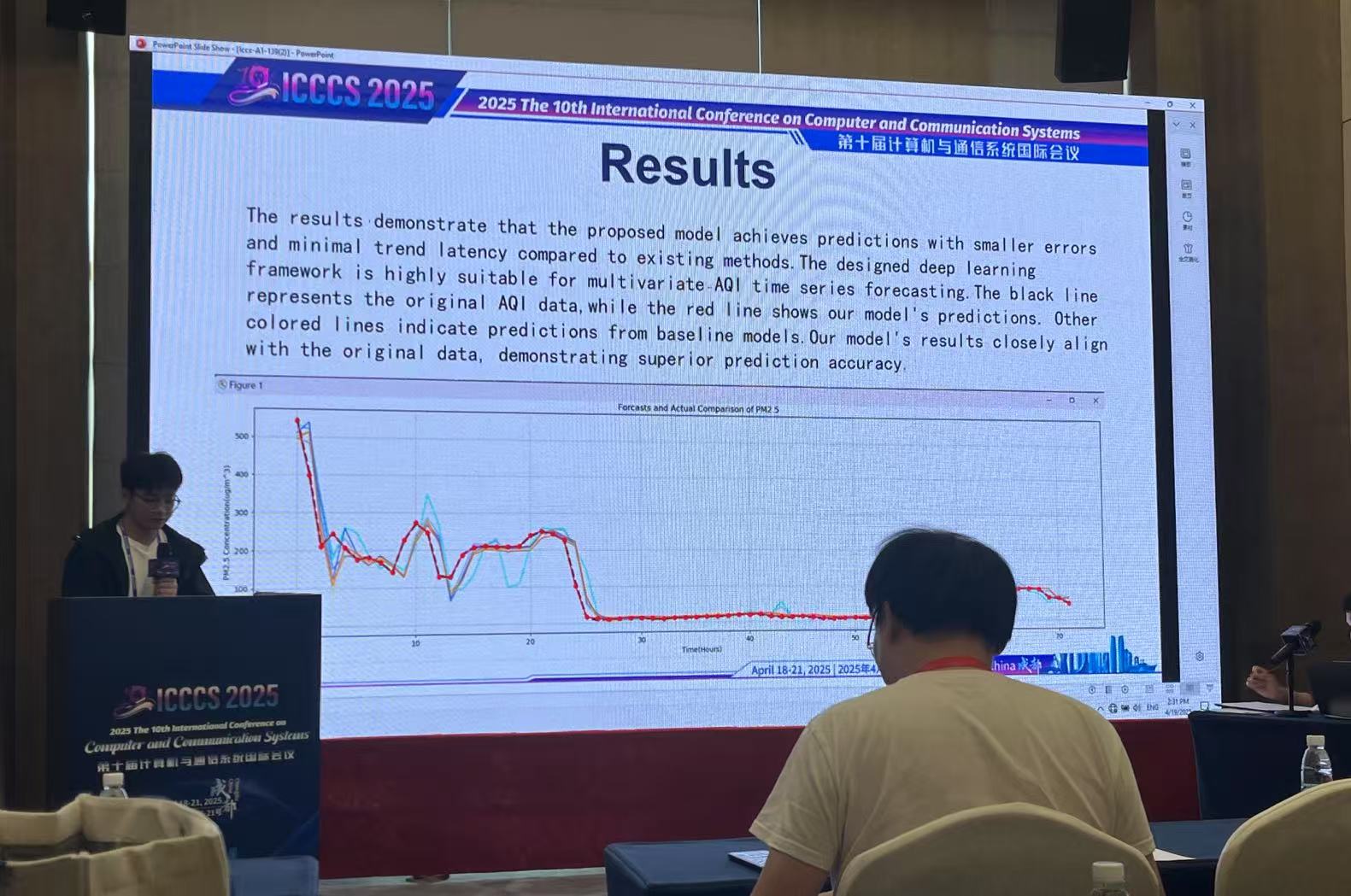 在“智能环境感知与预测”分论坛中,beat365官网大数据与人工智能学院李王建同学代表网络与信息系统软件实验室,作了题为《基于NLSTM的多任务空气质量预测模型》的学术报告。该研究创新性地将神经逻辑网络与长短期记忆模型相结合,在空气质量多指标联合预测任务中取得突破性进展,现场与悉尼科技大学、早稻田大学等国际团队进行了深入的技术探讨。