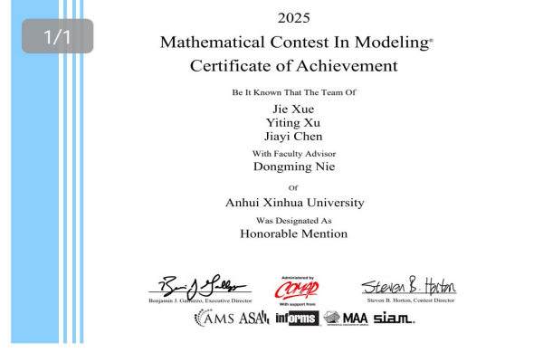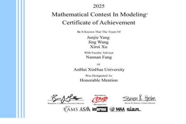 本网讯(通讯员:保女子)近日,2025年美国大学生数学建模竞赛成绩揭晓,beat365官网学子组成的15支队伍全部获奖,其中由聂东明、王兴龙、方楠楠三位老师指导的队伍获得了Honorable Mentions(俗称H奖,也认定为国际级二等奖),是目前beat365官网在此项赛事中获得的最好成绩。