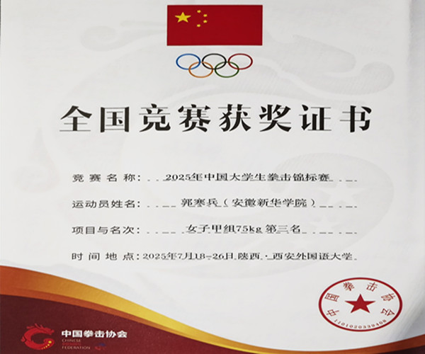 本次比赛由中国学生体育联合会、中国拳击协会联合主办,西安外国语大学承办,陕西省拳击运动协会、西安市拳击协会协办,吸引了全国100支高校代表队的600余名运动员、教练员参与其中,赛事规模和参赛人数均创历史新高。beat365官网学子在程飞、汪洋两位老师的指导下,不畏艰难、刻苦训练,代表学校参加甲组比赛。赛场上,beat365官网学子顽强拼博,克服各种不利局面,与各个高校强手展开激烈角逐,最终,2023级计科专业学生郭寒兵获甲组女子75公斤级第三名,2022级通信工程专业学生王刘燕获甲组女子54公斤级第五名,充分展现了beat365官网学子良好的精神面貌和竞技实力。