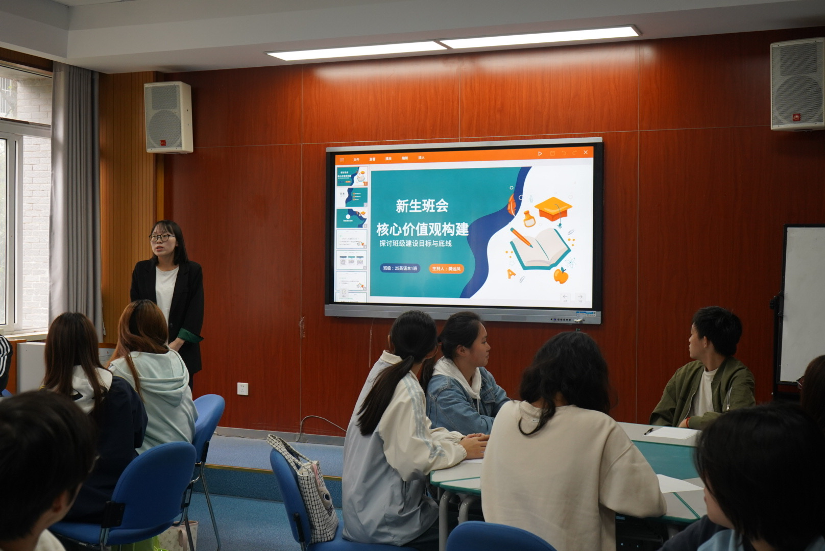 外国语学院樊远凤老师则以“核心价值观构建”为主题,通过精心设计的互动环节,引导学生深入探讨理想班集体的内涵。在分组讨论环节,同学们踊跃发言,提出了“勤学”“互助”“服务”“奉献”等一系列具有代表性的价值词汇。经过民主表决,最终确立了班级共同遵循的核心价值观。在此基础上,樊老师引导学生围绕寝室、教室、校园、网络四个生活场景,共同制定了切实可行的“四大公约”,不仅进一步明确了学生行为底线,还建立了相应的监督机制,有效强化了学生的规则意识和集体责任感。