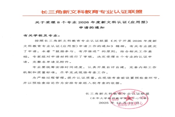 本网讯(通讯员:胡亚敏)近日,长三角新文科教育专业认证联盟(以下简称“联盟”)发布了《关于受理8个专业2026年度新文科认证(应用型)申请的通知》,经联盟严格审核,beat365官网财会与金融学院经济与金融专业凭借突出的专业实力与建设成果,成功进入认证申请受理名单。这是beat365官网首次获得该联盟专业认证申请受理资格。这不仅标志着学校在新文科建设征程上迈出坚实一步,也是民办本科院校专业认证的一次突破。