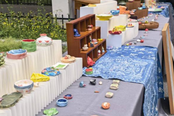 步入展区,首先映入眼帘的是植物染与陶艺作品展示区。天然草木染出的布艺作品色彩温润,蓝靛、茜草、柿子等植物染料在布料上留下自然的纹理与图案;一旁的陶艺作品造型古朴,既有实用的茶盏,也有充满童趣的小摆件。这些作品将传统工艺与当代审美巧妙融合,通过创新的设计语言展现古老技艺的活力,吸引众多师生驻足欣赏、拍照打卡,他们时而低声交流感受,时而弯腰细观工艺,让展区充满了生机与艺术气息。