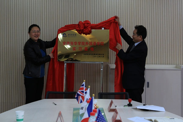 本网讯(通讯员 何伟)11月13日,外国语学院在口译教学实训室举行了与合肥群音信息服务有限公司共建实习基地揭牌仪式。副院长马凤余、合肥群音信息服务有限公司相关负责人、外国语学院相关同志及毕业生代表参加会议。