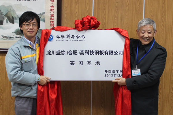 本网讯(通讯员 王冠亮)12月13日,外国语学院与淀川盛馀(合肥)高科技钢板有限公司共建实习基地举行揭牌仪式,外国语学院院长任静生教授与淀川盛馀公司管理本部副本部长增中康之等企业代表出席了本次仪式。