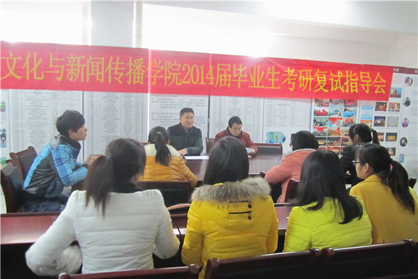 本网讯(赵影、张洁琼)为做好2014届考研学生的服务工作,3月4日上午,文化与新闻传播学院召开了2014届毕业生考研复试指导会。文化与新闻传播学院院长谢昭新以及17名准备参加考研复试的同学参加了指导会。