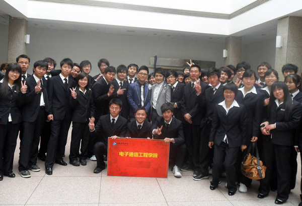 节目结束后,节目主持人阿进和小潘潘与电院师生进行合影留念。(电子通信工程学院)