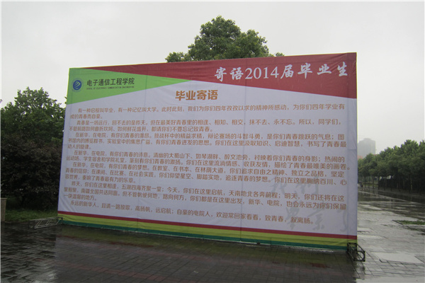 电子通信工程学院大力提倡营造文明、和谐的离校氛围。在教学楼前的LED显示屏上打上精心挑选的离校标语;在教学楼前安装了“寄语2014届毕业生”大型桁架,寄语毕业生,“致青春,话离殇”;在教学楼进口、离校办理教室门口、毕业班辅导员办公室门口张贴《文明离校倡议书》,祝福同学们一帆风顺,告诫同学要在今后的工作中要务实做事,奋发成才。