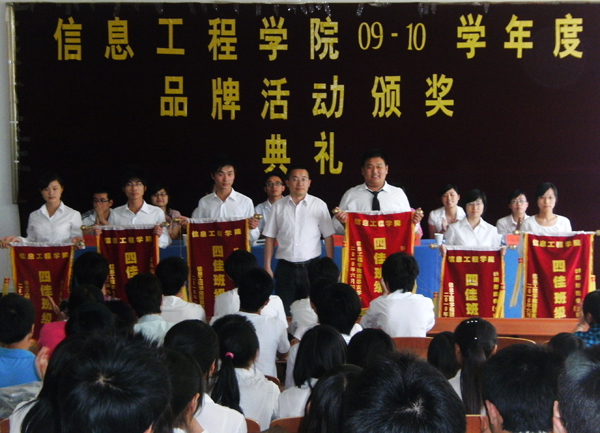 6月4日中午,信息工程学院2009—2010年度品牌活动颁奖典礼在信息工程学院隆重举行,行政副院长、学管秘书、行政秘书以及班级辅导员老师代表出席了本次颁奖典礼。