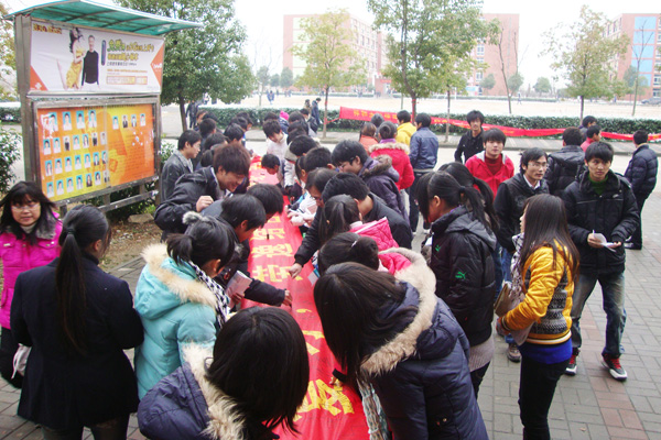 学海泛舟,本学期的期末考试也即将到来,这既是一次对同学们学习成果的检验,也是对老师辛勤工作的最好回报。为了倡导同学们积极努力的投入到期末复习中,通过考试展现同学们的真实水平,信息工程学院于2010年12月15日中午,举行了以“认真复习,劳逸结合,严守考纪,共创佳绩”为主题的签名活动。