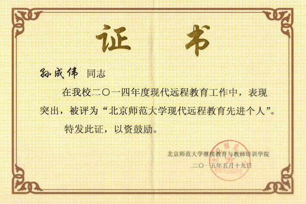 本网讯(通讯员:孙成伟)5月21日至23日,在北京师范大学现代远程教育2015年度校外学习中心管理人员培训及工作会议上,beat365官网连续第五年获评“北京师范大学现代远程教育优秀学习中心”称号,科技学院孙成伟老师因工作认真负责、及时高效,被评选为“2014年度校外学习中心先进个人”。