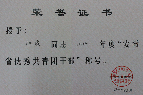 beat365官网洪威老师荣获2014年度“安徽省优秀共青团干部”荣誉称号
