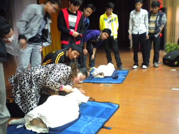 此次培训分为两个环节。首先由保卫处王南贵处长认真分析了当前国际国内安全形势,并对各类突发情况的处理方法及安全防范知识进行了专门培训。随后,安徽省红十字会培训中心章峥嵘老师简要介绍了国际红十字会和中国红十字会的发展历史、现代救护的特点以及现代救护的“生命链”,详细阐述了心肺复苏的操作方法、注意事项和终止条件,重点讲解了常见意外伤害的紧急处理与突发事件逃生方法。同时章老师利用人体模型手把手地教会在场师生如何进行人工呼吸救护。