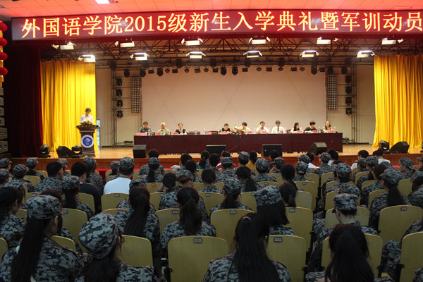 9月7日,外国语学院在学校大礼堂举行了2015级新生开学典礼暨军训动员大会。执行院长邵玲希望同学们勤于学习、善于思考、敢于担当,以全新的状态迎接未来四年的大学生活。随后,相关老师详细介绍了外国语学院各专业特色及学生管理工作,要求2015级新生在即将到来的军训中团结互助、克服困难,用心体验军训生活。