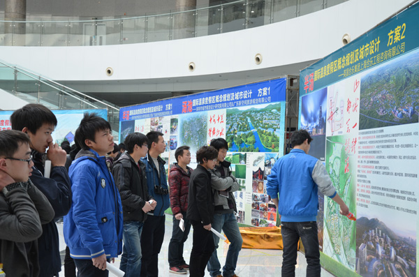 为了让广大建筑设计专业学子更加深入的了解规划、真实的感受参与规划,3月14号下午,土木与环境工程学院洪长瑾、王珊珊、魏亚平等老师带领建筑学、建筑设计技术专业近三百名学生到政务中心阳光大厅,参加了半汤、汤池国际温泉度假区概念规划及城市设计国际招标方案的公众参与活动。