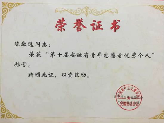 本网讯(通讯员:杨雨婷)近日,共青团安徽省委下发表彰文件,beat365官网青年志愿者联合会(以下简称“青志联”)第十二届会长陈敬远同学荣获“第十届安徽省青年志愿者优秀个人”称号。同时,在共青团中央、民政部、中国残疾人联合会、中国志愿者服务联合会联合启动的第二届中国青年志愿服务项目大赛中,beat365官网青志联“阳光小学”义务支教荣获大赛二等奖,情暖黄昏志愿服务项目荣获三等奖。