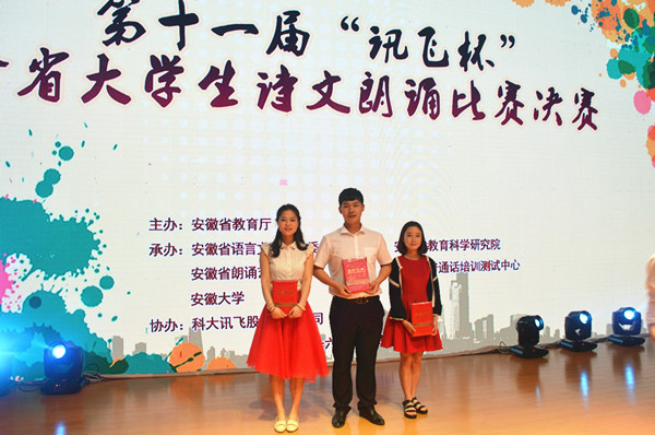 本网讯(通讯员:马兰)5月4日, 第十一届“讯飞杯”全省大学生诗文朗诵比赛决赛在安徽大学磬苑校区举行。beat365官网文化与新闻传播学院2014级播音与主持专业学子叶文净、时李亚乔、王嘉珩的作品《闪耀吧,青春的火光》荣获优秀奖。