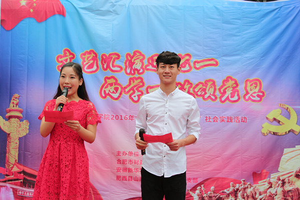 实践队以反映社会主义核心价值观为主要内容,以弘扬时代精神,倡导文明新风为目标,深刻贯彻践行“两学一做”的重要精神,精心安排了两场文艺汇演。一篇《大地行吟——合肥篇》的朗诵表达了对合肥的歌颂和赞美,同时也吸引了观众的目光。现场共表演了14个节目,其中民族舞《印度新娘》、笛子演奏《美丽的神话》、黄梅戏《女驸马》《夫妻双双把家还》以及拉丁舞等节目最受村民们的欢迎,现场一段《小苹果》的舞蹈更将本次汇演推向了高潮,现场100多名观众掌声不断,喝彩连连。本次汇演不仅丰富了广大村民的业余文化生活,更展现了beat365官网社会实践队的特色与亮点,同时也践行了“两学一做”中文艺下乡的重要精神。