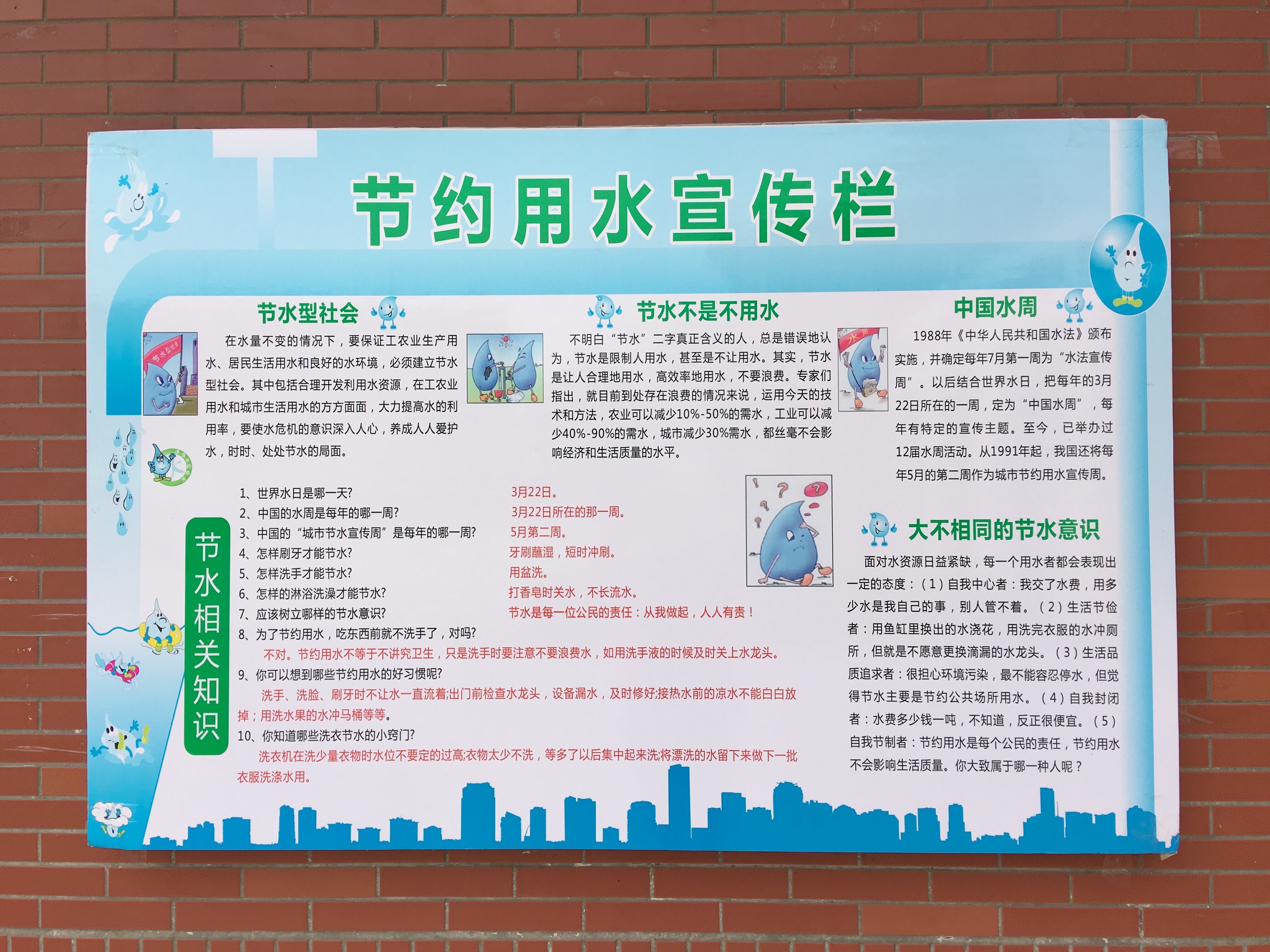为广泛深入地开展水法普及活动,总务处提前制定了2017校园节水周活动方案,并于节水宣传期间开展了在学校公共区域及宿舍楼、教学楼悬挂节水知识条幅, 张贴节水宣传展板,电子显示屏循环播放节水宣传口号等形式多样、内容丰富的系列节水活动。